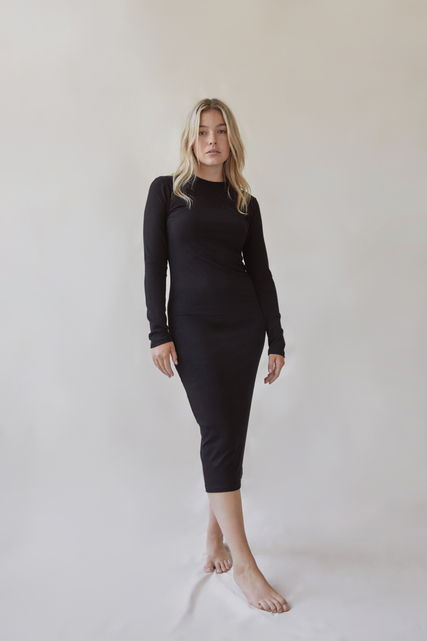 This minimalist and clean dress pays homage to the inherent qualities of nature and the body. Cut to fit your curves, this black longsleeve dress is the perfect travel piece – it features super long arms and a crew neck which adds a hint of elegance to an everyday basic. A piece that simplifies getting dressed.