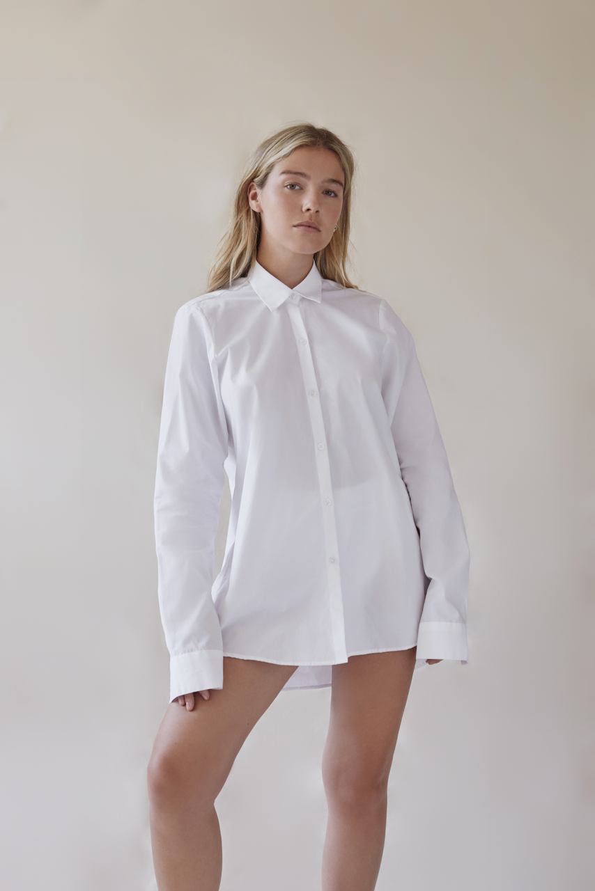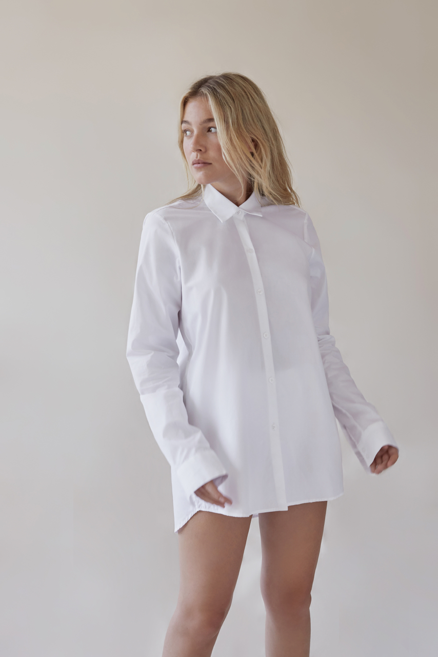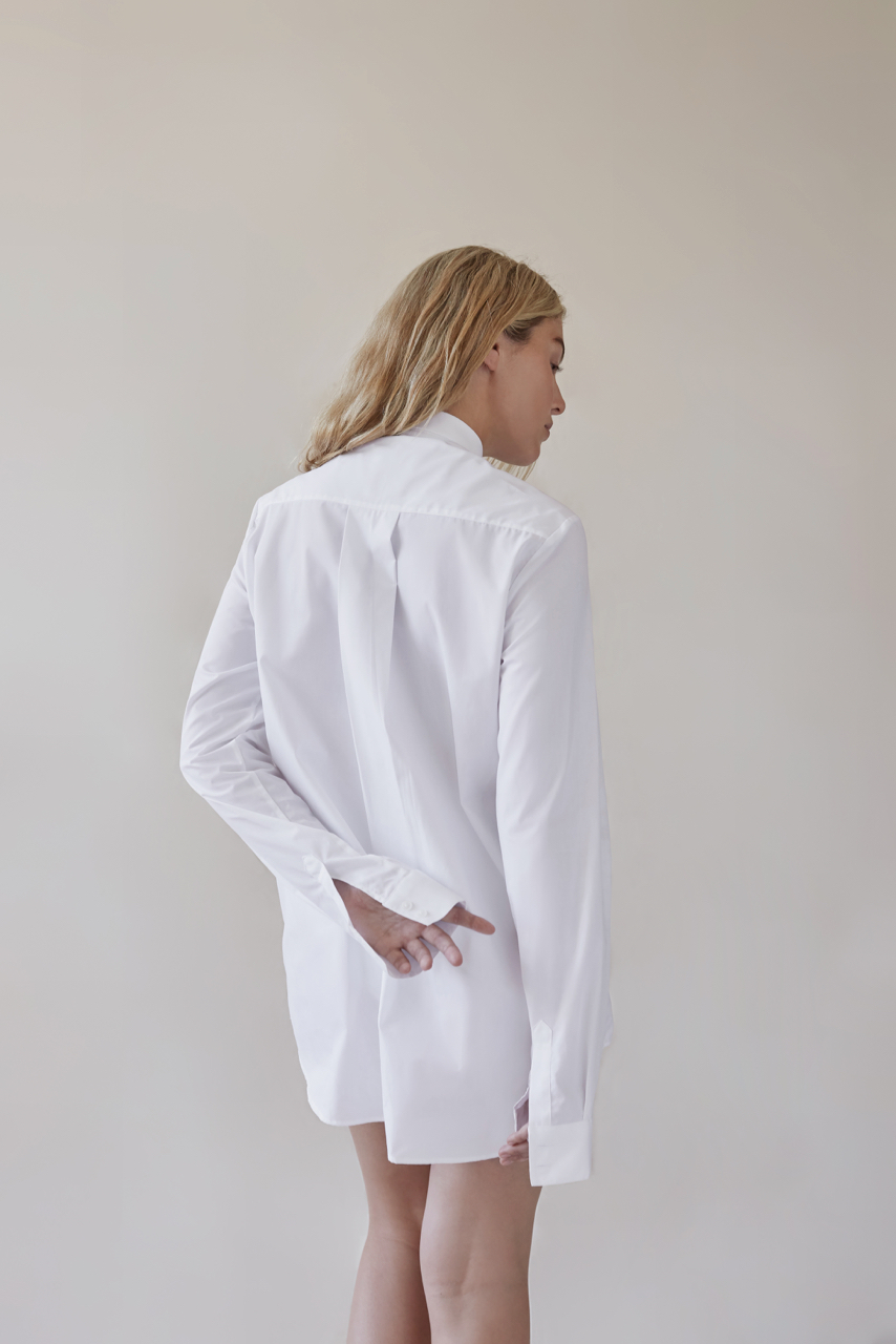 This man shirt, crafted from crisp cotton poplin and cut in a loose fit, can be a dress on warm summer days. The collar and sleeves have an extra stiffness for a masculine and clean look. Finishing touches include a gently curved hem, two-button cuffs and a back yoke with center box pleat. Inspired by Lou Doillon.