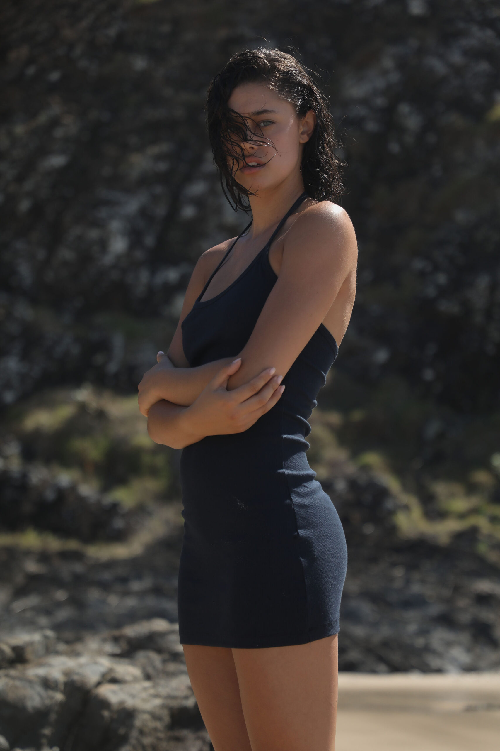 Our thoughtfully designed navy dress is made of the softest organic cotton and skims beautifully against the body. It blends 90s minimalism with the natural beauty of coastal surrounds, evoking a sense of calm and simplicity. Sustainable in production and design.